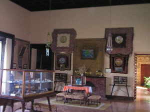 Gleich nebenan befindet sich der Speisesaal mit Porzellan und Keramik aus früherer Zeit. Auf der Rückseite des Hauses liegt das einzige - recht kleine - Schlafzimmer, dass besichtigt werden kann. Es ist mit einem schönen alten aus Holz geschnitztem Himmelbett ausgestattet.
